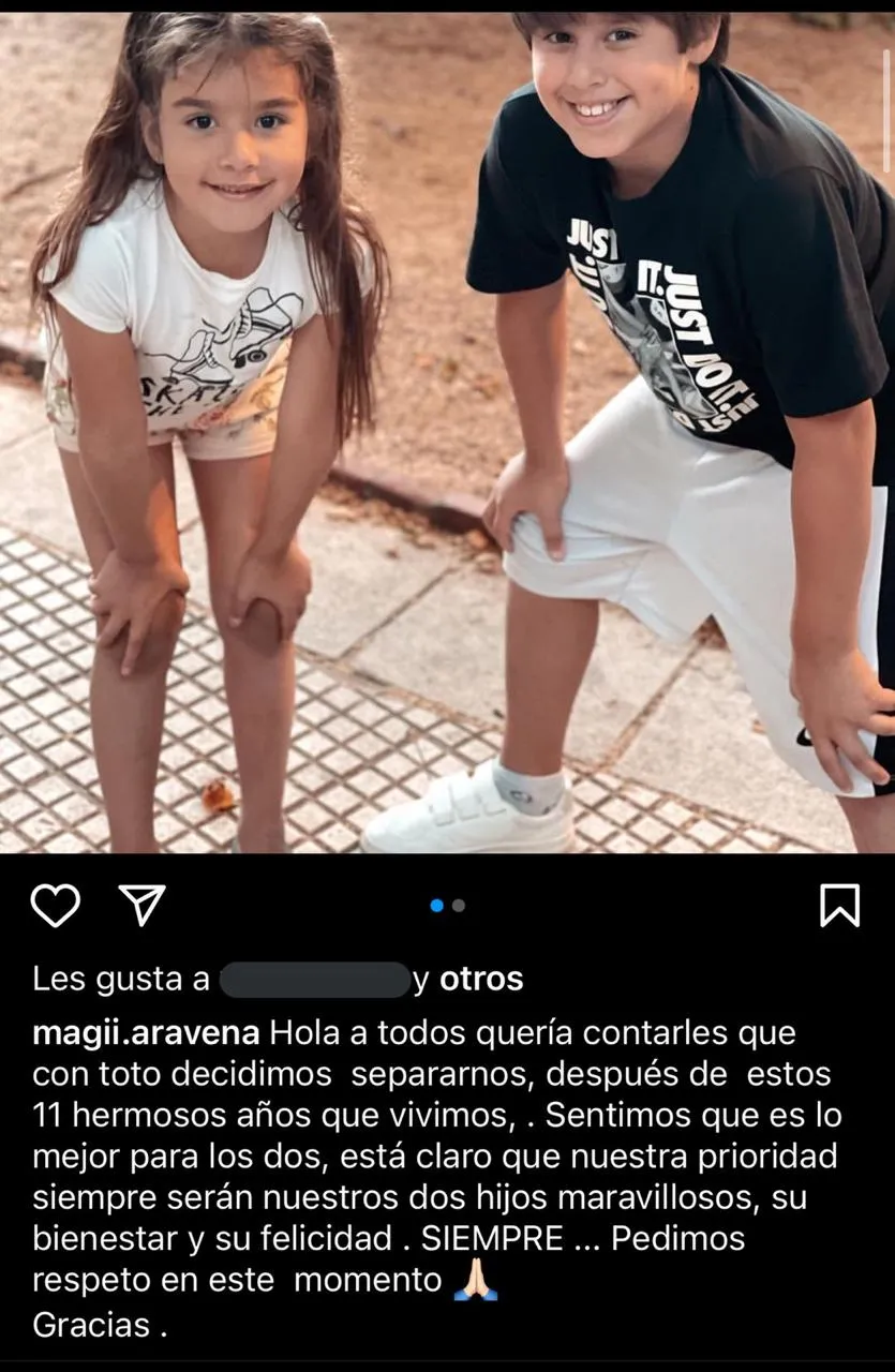 “Hola a todos. Quería contarles que con Toto decidimos separarnos, después de estos 11 hermosos años que vivimos. Sentimos que es lo mejor para los dos, está claro que nuestra prioridad siempre serán nuestros dos hijos maravillosos, su bienestar y su felicidad. SIEMPRE. Pedimos respeto en este momento, gracias”.