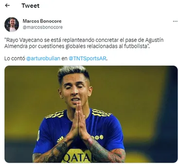 El equipo de Vallecas está analizando todo lo que rodea al presente y el pasado del volante de 23 años. “Rayo Vayecano se está replanteando concretar el pase de Agustín Almendra por cuestiones globales relacionadas al futbolista”, destacó el periodista Arturo Bulián en TNT Sports.