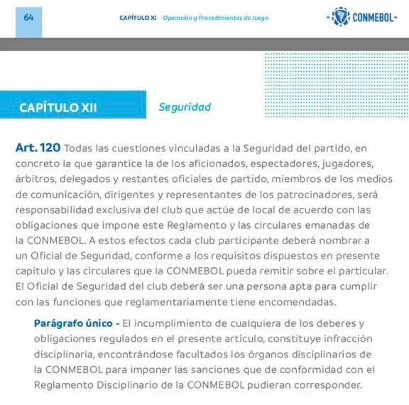 “Todas las cuestiones vinculadas a la seguridad del partido (…) serán responsabilidad exclusiva del club que actúa de local“, enuncia el reglamento. Y agrega: “El incumplimiento de cualquiera de los deberes y obligaciones regulados en el presente artículo constituye infracción disciplinaria, encontrándose facultados los órganos disciplinarios de CONMEBOL para imponer las sanciones que de conformidad con el Reglamento Disciplinario de la CONMEBOL pudieran corresponder”.