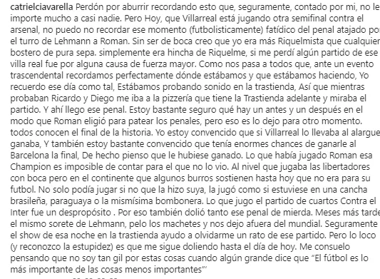 Catriel Ciavarella, baterista de Divididos, una de las bandas más emblemáticas del rock argentino, rememoró aquel fatídico penal fallado por El Torero y contó cómo vivió esa situación. El músico, confeso hincha de San Lorenzo, no tuvo ningún problema en mostrar su admiración por Román: “Yo era más Riquelmista que cualquiera. Simplemente, era hincha de Riquelme”.