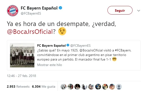 El duelo con el Bayern volvió a surgir gracias a las redes sociales. En su cuenta oficial de Twitter en español, el club repasó un poco de su historia y recordó un viejo cruce: en 1925, ambos equipos se enfrentaron en Alemania, en el primer partido de un equipo argentino en territorio europeo.