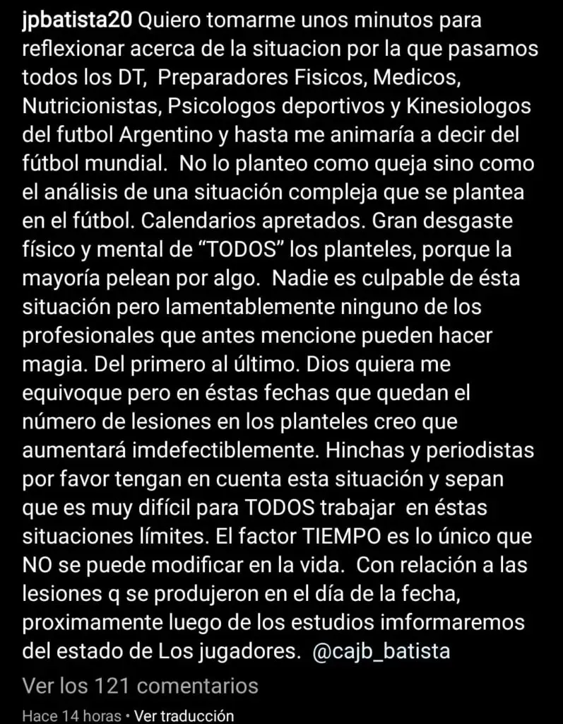 Luego del partido y de la lesión de Marcos, el médico de Boca, Jorge Batista, escribió una carta en su cuenta de Instagram. La del capitán pareció ser la gota que rebasó el vaso: “Quiero tomarme unos minutos para reflexionar acerca de la situación por la que pasamos todos los DT, Preparadores Físicos, Médicos, Nutricionistas, Psicólogos deportivos y Kinesiólogos del futbol Argentino y hasta me animaría a decir del fútbol mundial”, comenzó el Doctor.