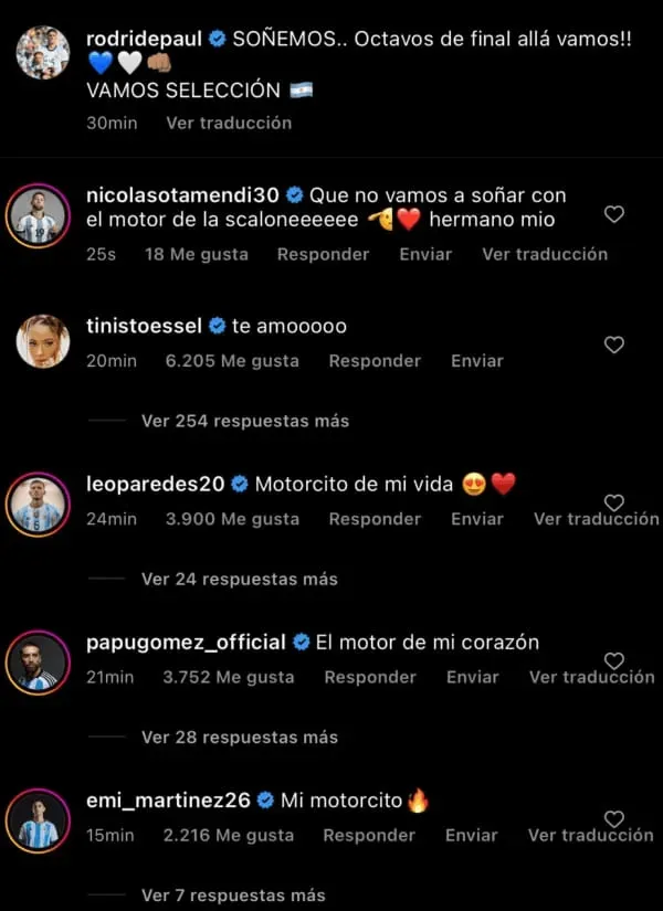 Como ya es costumbre, su posteo no tardó en llenarse de comentarios de varios integrantes de la “Scaloneta”. Nicolás Otamendi, Leandro Paredes, Alejandro “Papu” Gómez y Dibu Martínez, entre otros, le contestaron a Rodrigo. ¡Y revelaron su curioso apodo!