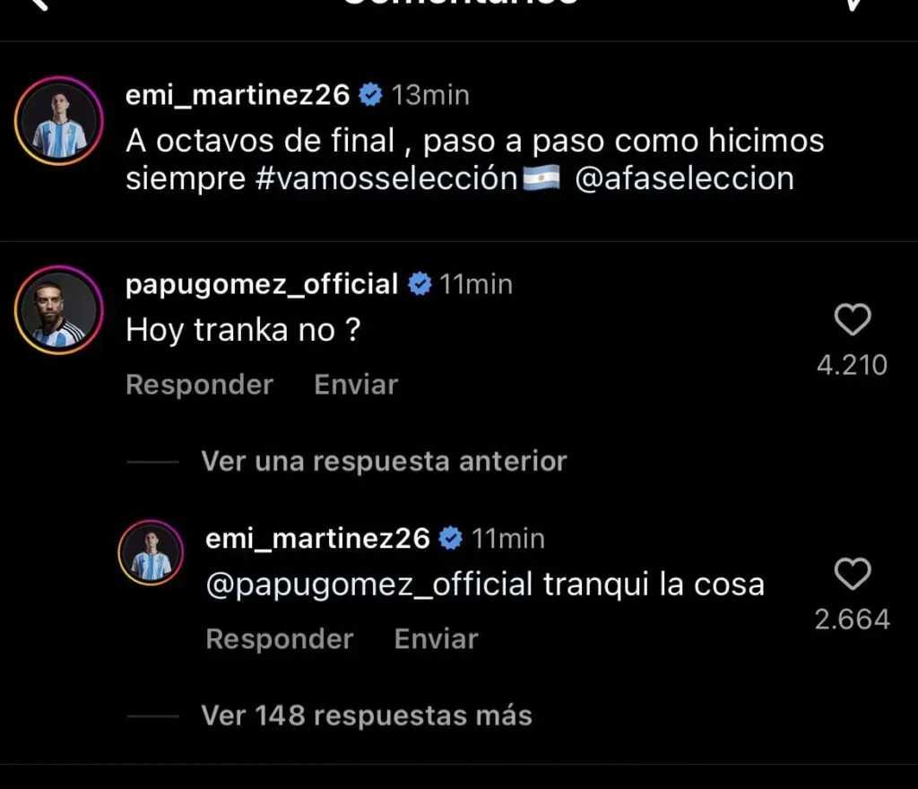 El volante, reconocido como uno de los más divertidos del plantel, le respondió en referencia a la poca actividad que tuvo durante el partido: “¿Hoy tranka no?” y su comentario explotó de likes. Dibu le siguió el juego y puso: “Tranqui la cosa”. Argentina, distendida, ya piensa en octavos.