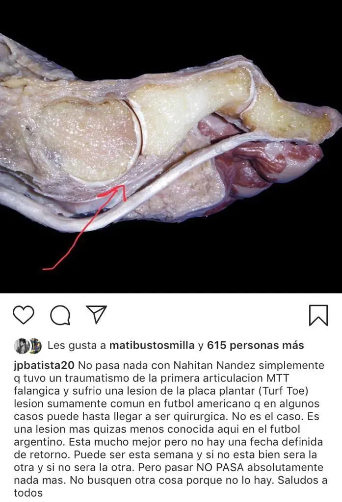 “No pasa nada con Nahitan Nández, simplemente que tuvo un traumatismo de la primera articulación MTT falángica y sufrió una lesión de la placa plantar (Turf Toe). Lesión sumamente común en el fútbol americano que, en algunos casos, puede hasta llegar a ser quirúrgica. Este no es el caso. Es una lesión más, quizás menos conocida en el fútbol argentino. Está mucho mejor pero no hay una fecha definida para su retorno. Puede ser ésta semana y si no está bien, será la otra. Y si no, la otra. No busquen otra cosa porque no lo hay”.
