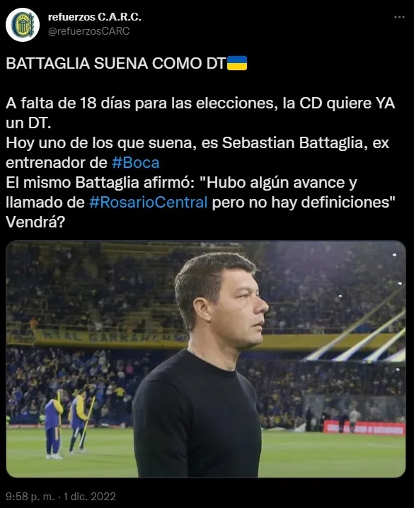 Por eso no sorprendió la noticia que dio un medio partidario de Rosario Central: al parecer, Battaglia está en la órbita del Canalla. “Battaglia suena como DT. A falta de 18 días para las elecciones, la CD quiere YA un DT. Hoy uno de los que suena, es Sebastian Battaglia, ex entrenador de Boca. El mismo Battaglia afirmó: ‘Hubo algún avance y llamado de Rosario Central pero no hay definiciones’. ¿Vendrá?“, fue el tuit. ¿Se dará?