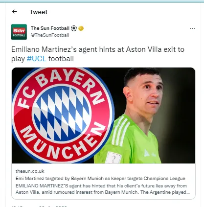 Según informó The Sun, el Bayern Munich es el equipo que tendría en carpeta al Dibu y podría sumarlo en este mercado de pases. ¿A qué se debe el interés? Manuel Neuer, el dueño del arco bávaro, se fracturó una pierna mientras practicaba y se perderá buena parte de lo que resta de la temporada.
