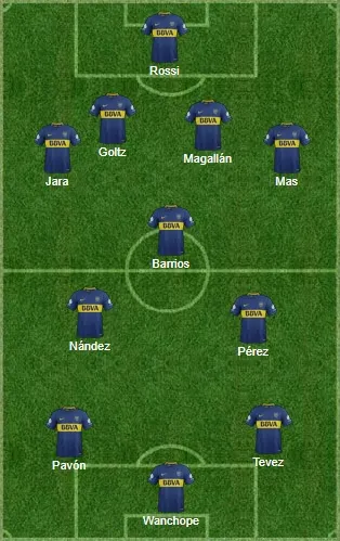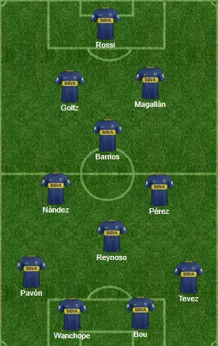Boca terminó jugando con ¡cuatro delanteros! Wanchope y Bou dentro del área. Tevez, alternándose. Pavón como extremo y Reynoso, Pérez y Nández en el medio, con Barrios más tirado atrás. Y sólo dos defensores en el fondo. Vale aclarar que, luego del gol del empate, Tevez salió e ingresó Buffarini.