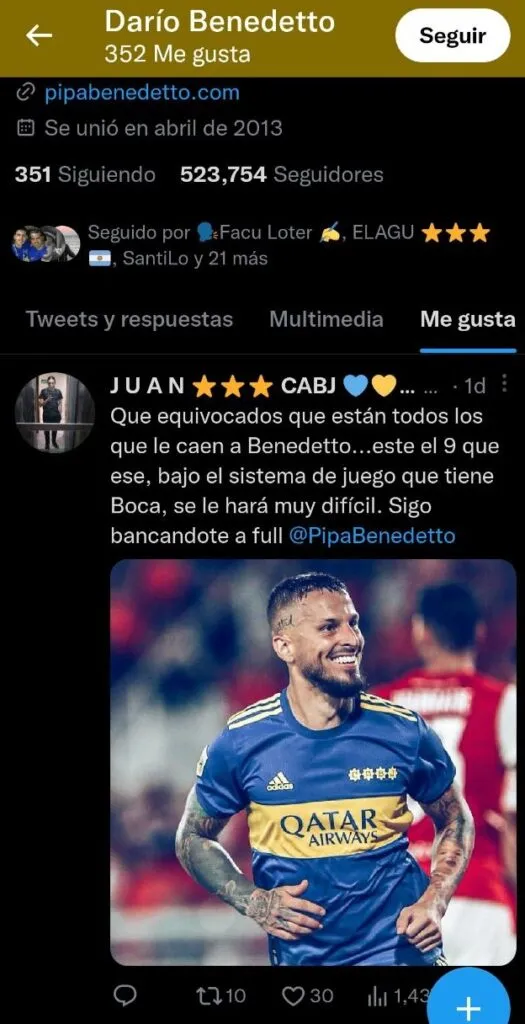 Ahora, mientras se rumorea que Boca puede buscar un delantero de jerarquía, un ‘like’ de Benedetto en Twitter llamó la atención de todos. El “Pipa” le dio ‘MeGusta’ a la publicación de un hincha con un mensaje claro: “Qué equivocados que están todos los que le caen a Benedetto… Esté el 9 que esté, bajo el sistema de juego que tiene Boca, se le hará muy difícil. Sigo bancandote a full Pipa”.