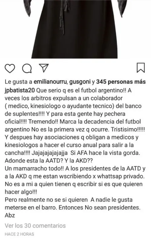 “Qué serio que es el fútbol argentino. A veces los árbitros expulsan a un colaborador (médico, kinesiólogo o ayudante técnico) del banco de suplentes. ¡Y para esta gente hay pechera oficial! ¡Tremendo! Marca la decadencia del fútbol argentino. No es la primera vez que ocurre. ¡Tristísimo! Después hay asociaciones que obligan a los médicos y kinesiólogos a hacer el curso anual para salir a la cancha ja ja ja. Si AFA hace vista gorda. ¿A dónde están la AATD (Asociación Argentina de Traumatología del Deporte) y la AKD (Asociación de Kinesiología del Deporte)? ¡Un mamarracho todo! A los presidentes de la AATD y AKD que me están escribiendo por WhatsApp privado. No es a mí a quien tienen que escribir si es que quieren hacer algo. Pero realmente no sé si quieren. A nadie le gusta meterse en el barro. Entonces, no sean presidentes. Abrazo”.