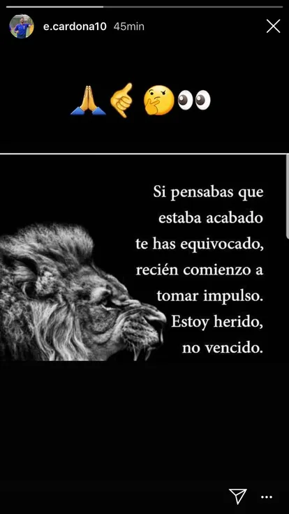 “Si pensabas que estaba acabado te has equivocado, recién comienzo a tomar impulso. Estoy herido, no vencido”, reza la frase que acompaña a la imagen con un león. ¡Vamos, Edwin!
