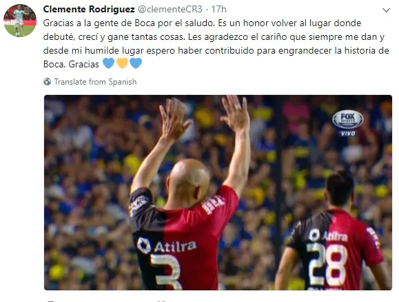“Gracias a la gente de Boca por el saludo. Es un honor volver al lugar donde debuté, crecí y gane tantas cosas. Les agradezco el cariño que siempre me dan y desde mi humilde lugar espero haber contribuido para engrandecer la historia de Boca. Gracias”.