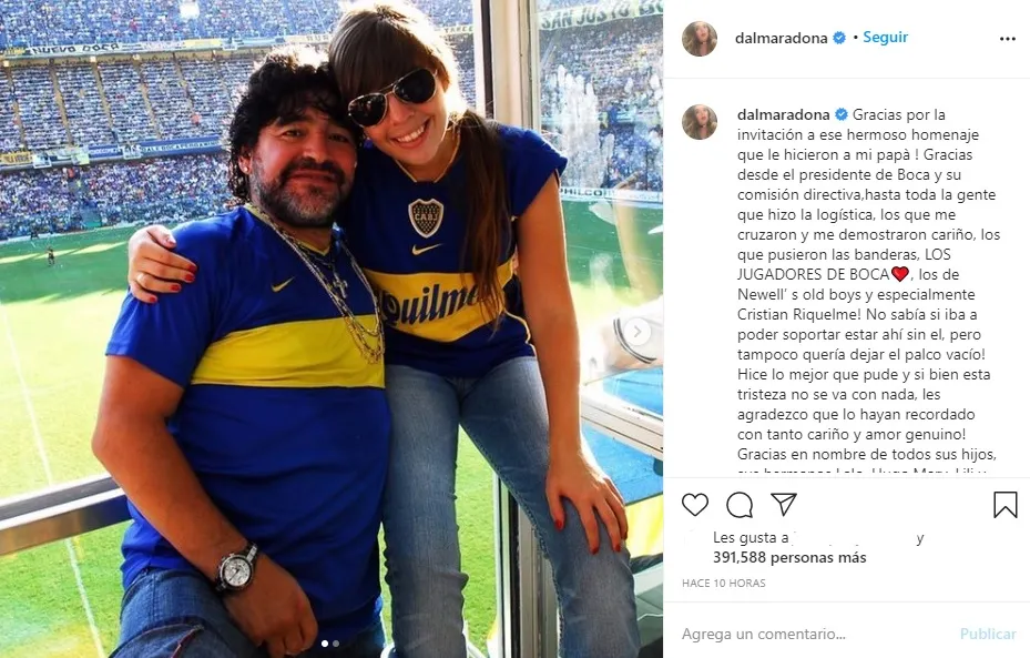 La hija de Maradona estuvo presente en el palco y escribió unas palabras para el club.