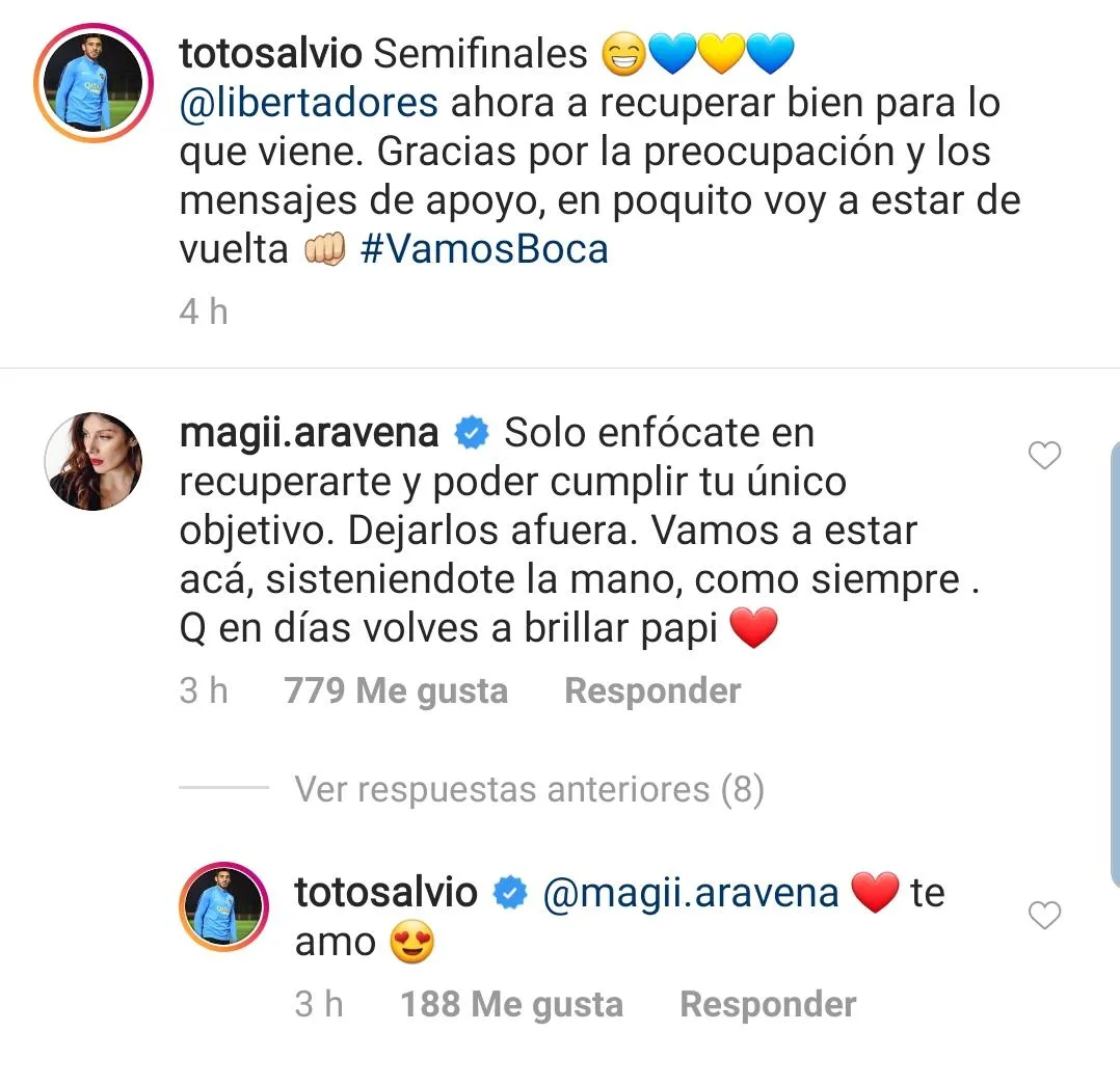 Como es costumbre, su familia siempre lo acompaña. Por eso, entre los comentarios, se destacó el de su mujer, Magalí Aravena. Y allí, brindándole su apoyo, dejó un mensaje de cara a las semifinales contra River: