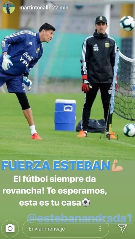 El cuerpo técnico fue uno de los que estuvo muy cerca de Andrada y Martín Tocalli utilizó las redes sociales para dedicarle un mensaje al ex Lanús y Arsenal. El entrenador de arqueros publicó en una historia de Instagram, una imagen de un entrenamiento y el siguiente mensaje: “Fuerza, Esteban. El fútbol siempre da revancha! Te esperamos. Esta es tu casa”.