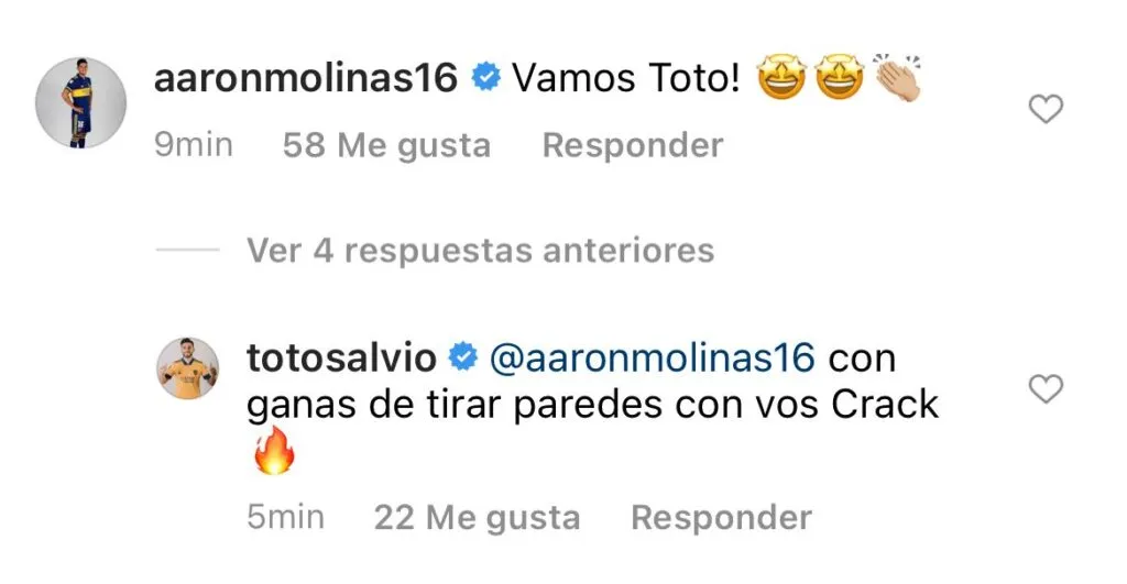 Minutos después de que el posteo esté en las redes, llegó el turno de un intercambio de mensajes con Aaron Molinas. “¡Vamos Toto”, soltó el pibe. “Unas ganas de tirar paredes con vos, crack”, respondió el exBenfica. ¿Nace una dupla?