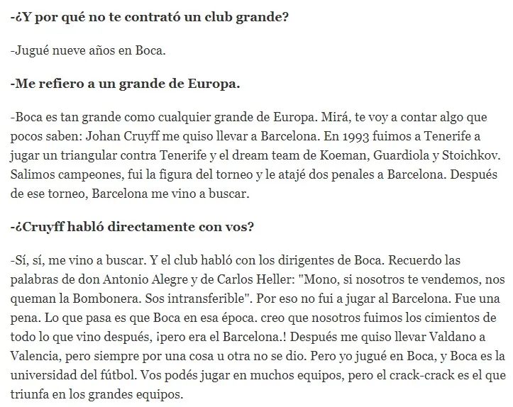 Además, el Mono contó una anécdota vivida en el año 1993, mientras Boca realizaba una gira por Europa: el mismísimo Johan Cruyff lo pidió para el Barcelona.