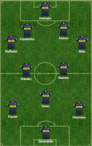 Esteban Andrada; Julio Buffarini, Carlos Izquierdoz, Junior Alonso, Emmanuel Mas; Wilmar Barrios, Nahitan Nández; Cristian Pavón, Carlos Tevez, Emanuel Reynoso; y Darío Benedetto.