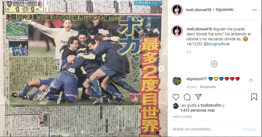 Pasaron 17 años de aquella gesta, Puchero no se olvida de lo sucedido y revive la consagración en las redes sociales con un posteo bastante particular: recortes de diarios japoneses, que reflejaron la importancia del triunfo boquense en tierras niponas.