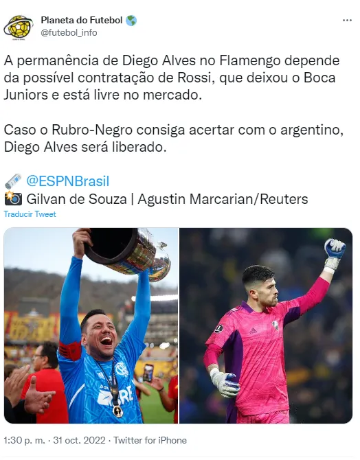 Así lo aseguró ESPN Brasil: “La permanencia de Diego Alves en Flamengo depende de la posible contratación de Rossi”. Alves, de 37 años, en este momento es el arquero suplente del club. En la Copa Libertadores, el dueño de los tres palos fue Santos.