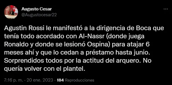 El periodista Augusto César dio los detalles: “Agustin Rossi le manifestó a la dirigencia de Boca que tenía todo acordado con Al-Nassr (donde juega Cristiano Ronaldo y donde se lesionó Ospina) para atajar 6 meses ahí y que lo cedan a préstamo hasta junio. Sorprendidos todos por la actitud del arquero. No quería volver con el plantel”. ¿Qué opinan?