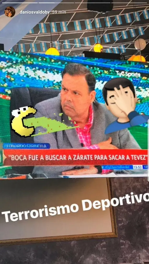 El exdelantero publicó en su cuenta de Instagram una captura de una imagen de televisión, de un programa deportivo donde afirmaban que Zárate llega a Boca para reemplazar a Tevez. Y no pudo evitar comentar algo: “Terrorismo deportivo”, con emojis que denotan asco.