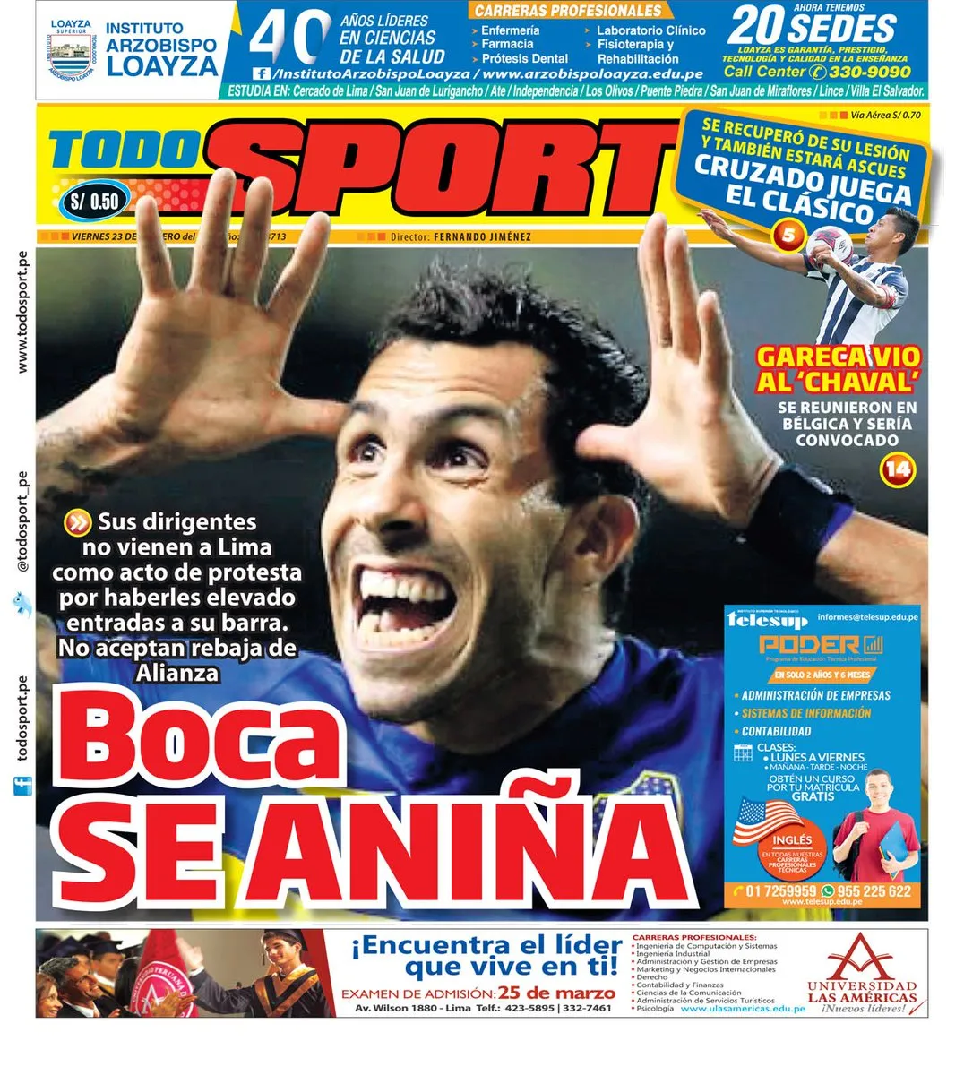 Los medios peruanos reflejan en sus portadas que el Xeneize miedo de llevar público al estadio y ponen la cara de Carlos Tevez en algunas tapas.