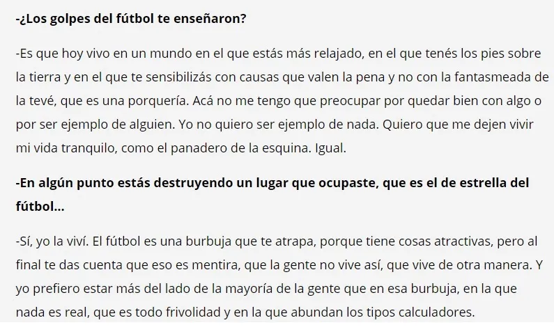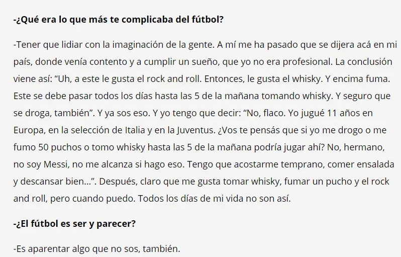 “Fue caro pagar el precio del fútbol. Ahora la gente es mucho más grata conmigo. Más amable. Este mundo (el del rock) me ayuda a entender otras cosas. El universo del fútbol te prejuzga mucho. Este país te prejuzga. Y al final, detrás hay una persona. Pero aprendí a que no me afecte. No me resultaba fácil el momento en el que estaba en el foco y me jodía que la gente dijera cosas de mí que no son. Pero aprendí. Con el tiempo me pude dar cuenta que no importa nada lo que digan Mirtha de Haedo, Joaquín de Burzaco o Jorge Rial, que nunca se tomó una birra conmigo. ¡Me chupa un huevo! Tomate una birra conmigo, charlemos un rato y después decime qué opinás”.
