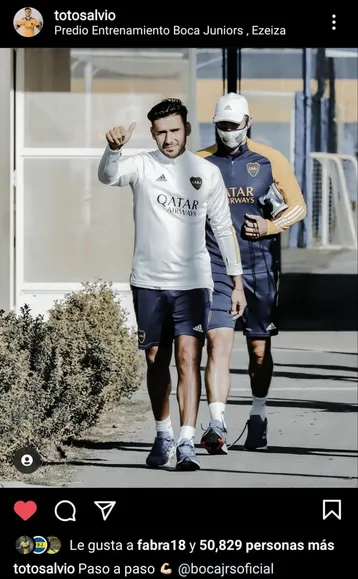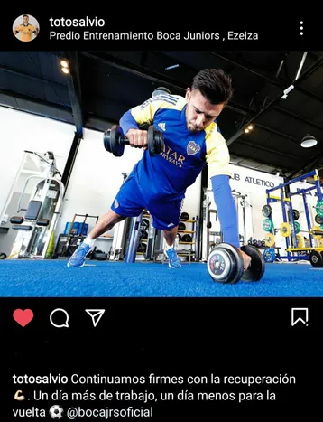 El 19 de abril, unas semanas después, Salvio le volvió a mandar un mensaje a los hinchas de Boca. Esta vez desde el gimnasio del Predio de Ezeiza, donde trabaja diferenciado y continúa con su recuperación. “Continuamos firmes con la recuperación. Un día más de trabajo, un día menos para la vuelta”, expresó Toto.