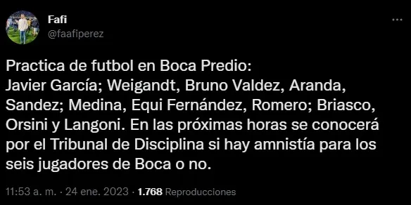 Si se confirma que Alan Varela, Sebastián Villa, Luis Advíncula, Guillermo “Pol” Fernández y Diego “Pulpo” González reciben la amnistía y están en condiciones de formar parte del encuentro, los primeros cuatro se meterán en el equipo. Boca esperará para ver qué sucede con esta situación.