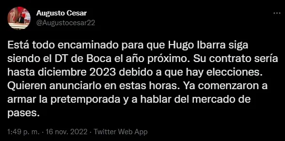 Así lo contó el periodista Augusto César en Twitter: “Está todo encaminado para que Hugo Ibarra siga siendo el DT de Boca el año próximo. Su contrato sería hasta diciembre 2023 debido a que hay elecciones. Quieren anunciarlo en estas horas. Ya comenzaron a armar la pretemporada y a hablar del mercado de pases”. El contrato de Ibarra se termina en diciembre pero renovaría por un año más. ¿Qué opinan?