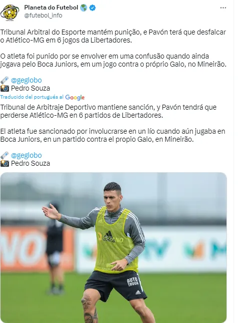 El castigo de Conmebol se debe al episodio ocurrido en la edición 2021, jugando para Boca justamente ante su actual club. Fue uno de los protagonistas de los disturbios tras la eliminación del Xeneize, que no lo anotó en la lista de buena fe de la Copa 2022 sabiendo que se iba a Mineiro. El Galo pudo inscribirlo para los 4tos. de final y cumplir dos fechas, pero decidió dejarlo afuera.