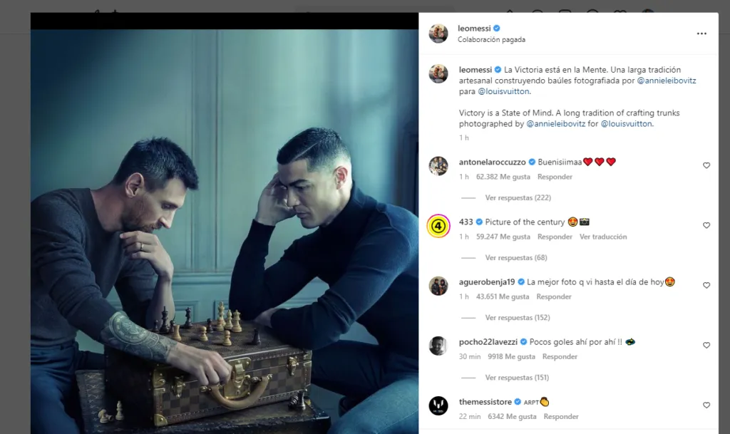 Se trata de una campaña de la empresa de indumentaria, Louis Vuitton, que logró juntar a las dos grandes figuras del fútbol mundial. “La Victoria está en la Mente” fue el eslogan que acompañó tanto el posteo de Lionel como el de Cristiano en sus cuentas de Instagram. Entre ambos suman más de ¡872 millones de seguidores!