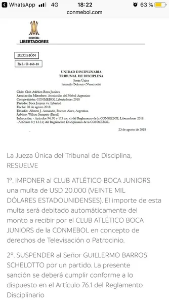 ¿Cuál es el motivo? La entidad del fútbol sudamericano lo multó por regresar tarde luego del entretiempo en la ida. Será suspendido por un partido y también habrá sanción económica: 20.000 dólares de parte de Boca y 1.500 de parte del DT.