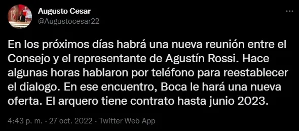 El periodista Augusto César contó: “En los próximos días habrá una nueva reunión entre el Consejo y el representante de Agustín Rossi. Hace algunas horas hablaron por teléfono para reestablecer el diálogo”. “En ese encuentro, Boca le hará una nueva oferta. El arquero tiene contrato hasta junio 2023”, agregó el cronista. ¿Habrá final feliz?