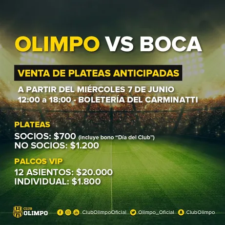 Mientras, las plateas para el partido ante Olimpo salen a la venta este miércoles. Serán vendidas para la gente de Bahía Blanca y la zona, en un radio de 350 kilómetros. Esta es la información que dio el club local: