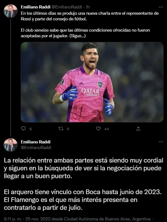 El periodista Emiliano Raddi lo contó en su cuenta de Twitter. “En los últimos días se produjo una nueva charla entre el representante de Rossi y parte del consejo de fútbol. El club xeneize sabe que las últimas condiciones ofrecidas no fueron aceptadas por el jugador”, aseguró.