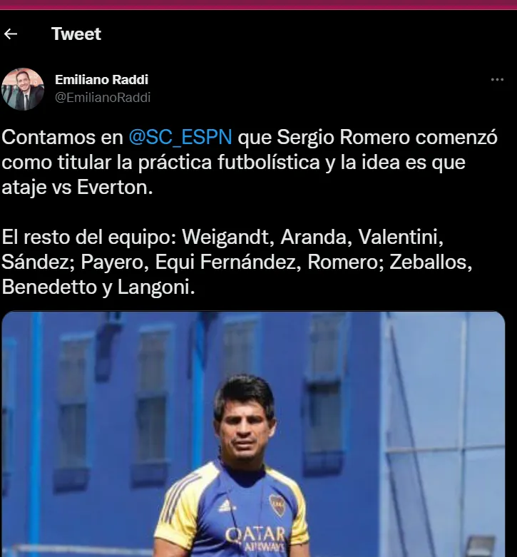 Así formaría Boca vs. Everton: Sergio Romero: Marcelo Weigandt, Gabriel Aranda, Nicolás Valentini, Agustín Sandez; Óscar Romero, Ezequiel Fernández, Martín Payero; Luca Langoni, Darío Benedetto y Exequiel Zeballos.
