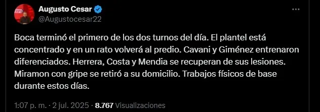 El periodista Augusto César reveló en ESPN detalles sobre la pretemporada de Boca en el Predio de Ezeiza. Y lo primero que contó fue que Ignacio Miramón no pudo entrenar por una gripe. Situación que lo hizo retirarse hacia su domicilio.