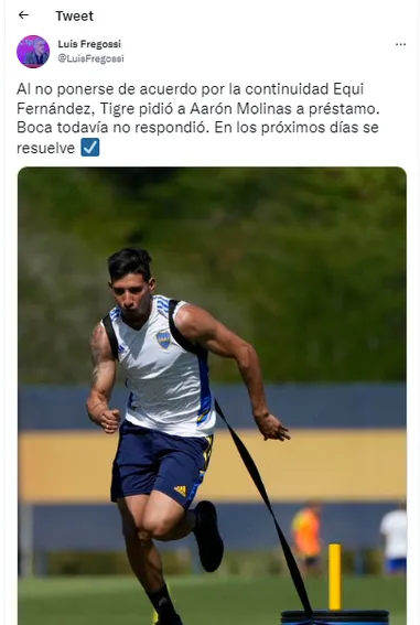 Y ese jugador sería Aaron Molinas (22). Así lo confirmó el periodista Luis Fregossi: “Al no ponerse de acuerdo por la continuidad Equi Fernández, Tigre pidió a Aarón Molinas a préstamo”. El volante ofensivo rechazó irse a préstamo dos veces durante el 2022 (Defensa y Justicia y al fútbol de Portugal), pero no pudo sumar muchos minutos en la Primera de Boca.