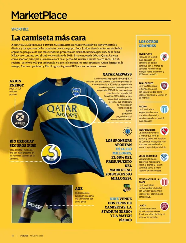 La Revista Forbes armó un informe con los números que genera la nueva casaca azul y oro. En principio, es la que más vende: un total de 300.000 por año, fabricadas por Nike.