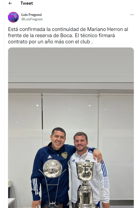 Según contó el periodista Luis Fregossi, ya estaría todo arreglado para que Mariano siga un año más al frente de la Primera:“Está confirmada la continuidad de Mariano Herrón al frente de la Reserva de Boca. El técnico firmará contrato por un año más con el club”, destacó el cronista.