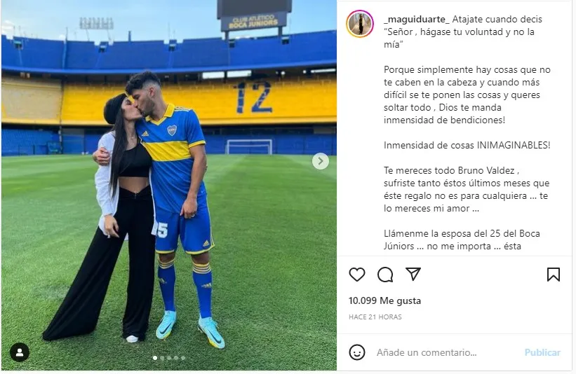 “Te mereces todo, Bruno Valdez, sufriste tanto estos últimos meses que este regalo no es para cualquiera…. Te lo mereces, mi amor”, publicó su esposa, quien luego le tiró flores al club de la Ribera: “Llámenme la esposa del 25 del Boca Juniors… no me importa… esta camiseta no es para cualquiera y sé que vos la vas a portar a la altura en cada juego, en cada compromiso… me explota el corazón! Te amo intenso!”.