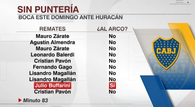 Un dato del partido arroja lo que todos vimos. Sólo hubo un tiro al arco en todo el partido y fue de Julio Buffarini. Además, fue a los 84 minutos. A Boca le costó generar juego y afinar la puntería.
