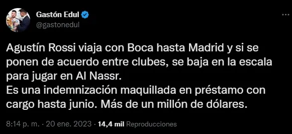 Además, Gastón Edul sumó: “Rossi viaja con Boca hasta Madrid y si se ponen de acuerdo entre clubes, se baja en la escala para jugar en Al Nassr“. La necesidad de un arquero de parte de un club que cuenta con muchísimo dinero para gastar coincide con el deseo de Rossi de tener rodaje en este semestre para llegar bien al Flamengo. Pero la última palabra la tiene Boca: ¿aceptarán cederlo a préstamo por un millón y medio de dólares?
