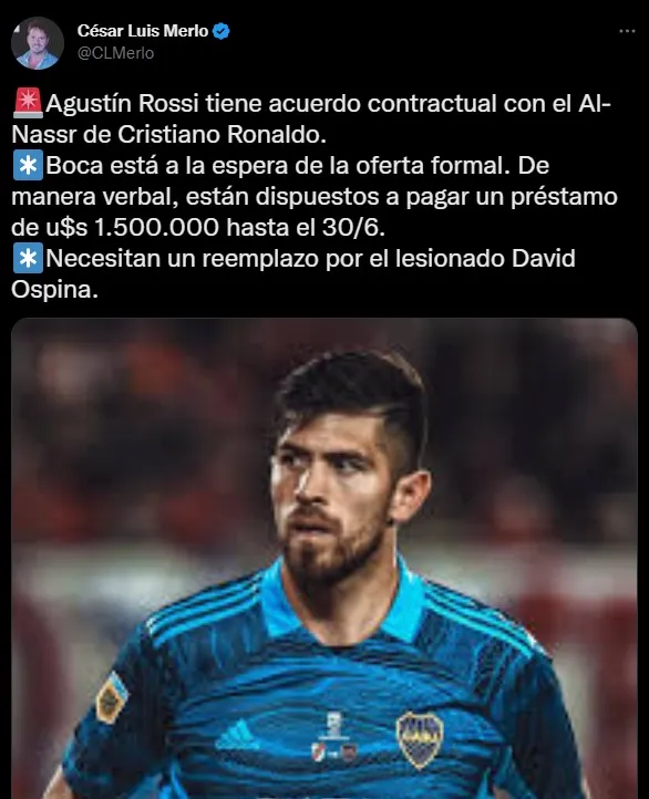 La noticia generó un fuerte impacto en las redes sociales. Y ahora se conocen los detalles de la propuesta del Al Nassr para Boca por Rossi. Según contó el periodista César Merlo, “Agustín Rossi tiene acuerdo contractual con el Al-Nassr de Cristiano Ronaldo. Boca está a la espera de la oferta formal. De manera verbal, están dispuestos a pagar un préstamo de u$s 1.500.000 hasta el 30/6. Necesitan un reemplazo por el lesionado David Ospina”.