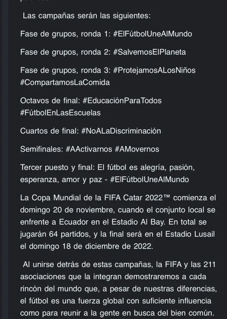 En esta búsqueda, la máxima entidad de la disciplina orientó las campañas a un mensaje de “paz mundial” a través del fútbol. Además, también se inclinó por temáticas sobre cuidado del planeta, la educación y la discriminación. En Argentina, Lionel Messi será el encargado de llevar los distintos brazaletes.