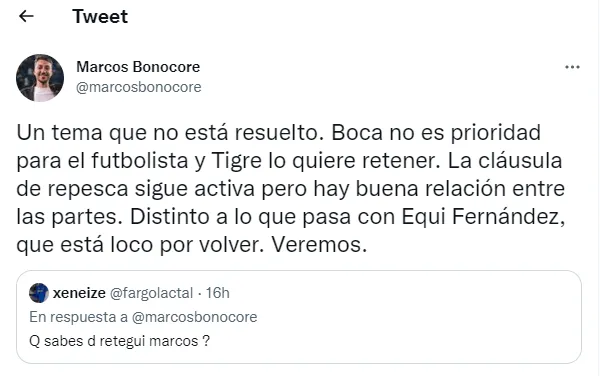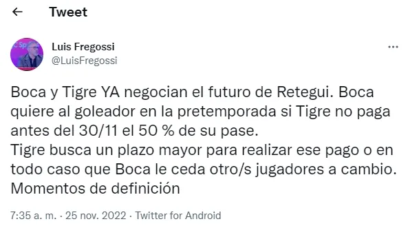 Por otra parte, sobre el tema, el periodista Luis Fregossi informó que Boca y Tigre ya negocian por el delantero: “Boca quiere al goleador en la pretemporada si Tigre no paga antes del 30/11 el 50 % de su pase”.
