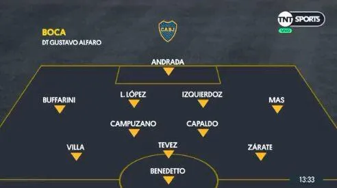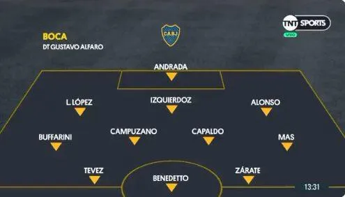 Mientras que en la otra opción que baraja, prioriza una línea de tres encabezada por Carlos Izquierdoz, Lisandro Lopez y Junior Alonso. Además, los dos laterales se adelantarían algunos metros relegando del equipo titular a Sebastián Villa. Por último, en la zona ofensiva aparece un tridente en el que se encuentran Carlos Tevez, Mauro Zárate y Darío Benedetto.