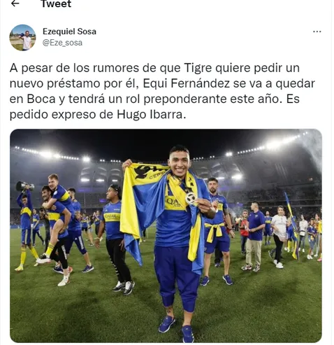 Así lo confirmó el periodista Ezequiel Sosa. “A pesar de los rumores de que Tigre quiere pedir un nuevo préstamo por él, Equi Fernández se va a quedar en Boca. Y tendrá un rol preponderante este año”, sostuvo el cronista. Y aclaró: “Fue un pedido expreso de Hugo Ibarra”.